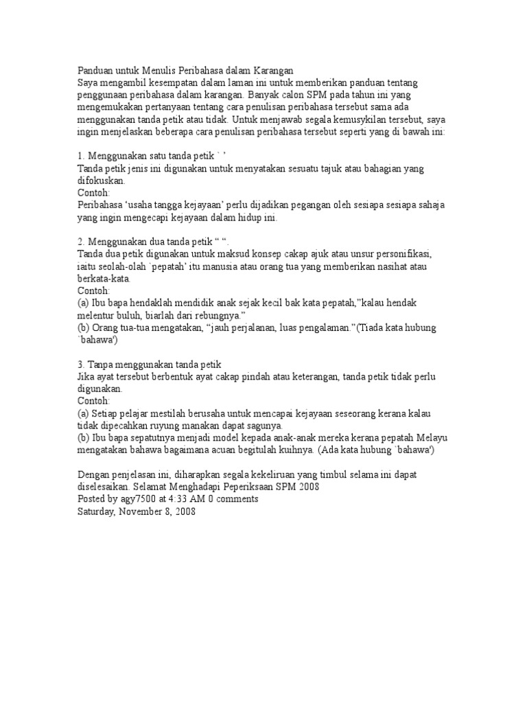 SPM KOMSAS Penulisan Tatabahasa Info PT3 Nota Novel STPM Tingkatan 4 Tingkatan 5 Karangan A PMR Tingkatan 1 Peribahasa Kesusasteraan Santai Bahasa Morfologi Rumus. Kemudian masukkan peribahasa atau gunakan ungkapan menarik yang dirasakan sesuai dalam mana-mana ayat pendahuluan itu tadi. Menggunakan satu tanda petik Tanda petik jenis ini digunakan untuk menyatakan sesuatu tajuk atau bahagian yang difokuskan.